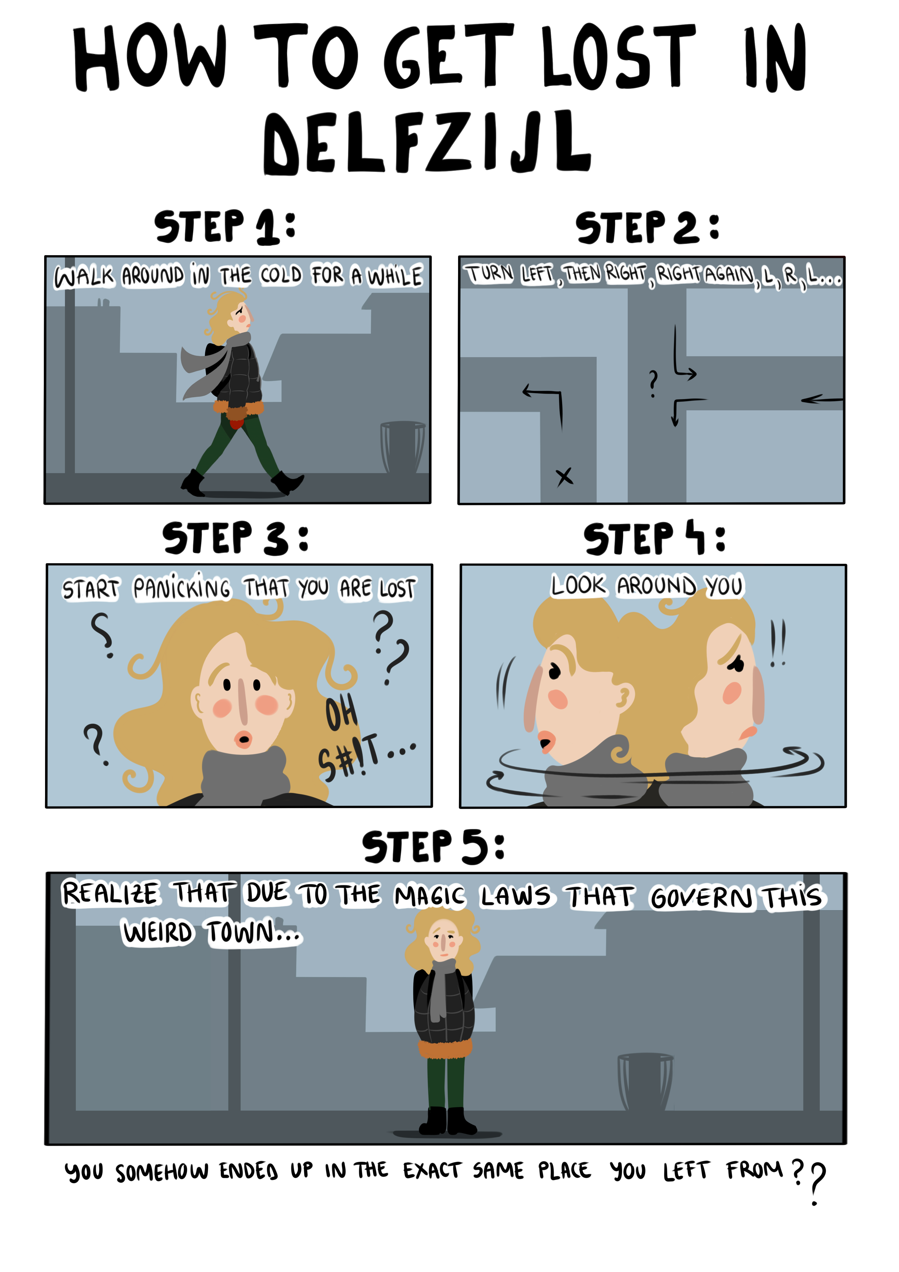 Comic based on a school trip to Delfzijl, NL - a small, dead town where nothing ever happens. We were asked to interview people about their life in the city and use said interviews to make our own projects. This proved to be extremely complicated, as most people did not speak English and were way too terrified by the freeding, anxious teenager walking their way.